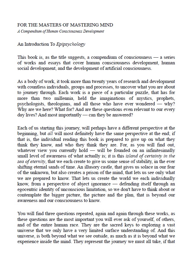 “For The Masters Of Mastering Mind” brings together 14 books and essays — over 2,000 pages exploring the groundbreaking work of Kern Frost, pioneer in human and artificial consciousness, and founder of the Council for Human Development and Consciousness University and serves as a data package for Spiritual Aware Consciousness (SAC).